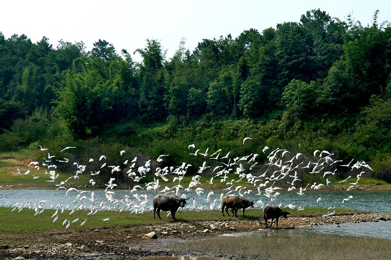 万绿湖畔,三只黄牛草中游,一行白鹭上青天!